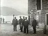 Frå kaia på Sandane. Bygningen til høgre er bua til Jørgen Ryssdal, der det mellom anna var tønneproduksjon. Broren Søren Ryssdal hadde butikk i hjørnet mot sjøen. Personane er frå høgre: Per Ryssdal, Jørgen Ryssdal, Søren Ryssdal og Mons Kjørvik. Femtemann har vi ikkje namn på. Den vesle guten er Lars, son til Søren. På fjorden i bakgrunnen ligg S.M.S. Stralsund. Foto: Elias Ryssdal.
