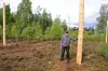 Fire stolpar ned i grunnen for å markere storleiken på gildehallen i hovudhuset til Eidehøvdingen markerer starten på å gjenskape gardsanlegget, fortel Knut Fjellestad.