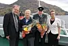 Ordførar i Gloppen Anders Ryssdal, viseadministrerande direktør i Fjord 1 Fylkesbaatane Svein Solheim, kaptein Elias Følsvik og ordførar i Eid Sonja Edvardsen er godt nøgde med å få på plass ei ny og betre ferje på Anda-Lote.