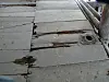 Slik er tilstanden ved omnsrøyret på veng-dekket. Roteskadar på treverk kring naglar og jarnsaum gjer at desse festemidla forsvinn.