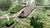 Slik ser ein føre seg at garden til Eidehøvdingen kan ha sett ut. Utgravingane viste at det har vore to store bygningar på Eidegarden. Hovudhuset var 43 meter langt og 8 meter breitt. Fjøsen var 24 meter lang og 7 meter brei, med plass til 40 storfe. Skisse: Arkikon.
