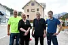 Styreleiar i Firda Tidend, Bjørn Grov (f.v.), marknadsansvarleg Bjørg Kjos-Wenjum, Atle Nygård og redaktør og dagleg leiar Aadne Gloppestad i jubileumskomiteen håpar på full Heradsplass laurdag 29. juni.