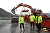 - Omtrent halvparten av all masse som blir driven ut av fjellet i samband med utbygginga i Øksenelvane blir frakta hit, og det er svært kjekt at steinen kan nyttast til noko fornuftig, seier Nils Erik Hestenes Rye, assisterande byggjeleiar i Øksenelvane. Her i lag med Jannicke Lindvik, avdelingsleiar for kommunikasjon og samfunnskontakt i SFE og Olav Hjelmeset (t.h.), dagleg leiar i Olav Hjelmeset AS.