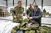 Forsvarsminister Bjørn Arild Gram og forsvarssjef Eirik Kristoffersen ser på dei nye soldatuniformene ved garnisonen i Sør-Varanger i Kirkenes fredag. Foto: Heiko Junge / NTB / NPK