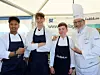 STJERNEKOKKAR: Dei to italienske stjernekokkane Franco Favoretti (t.h.) og John Mark Nanit (t.v.) skal lære Emil Kristiansen og Oliver Lamo, elevar ved Fitjar vgs.. å lage gode rettar av tørrfisk. Alle foto: Bjarte Brask Eriksen/Vestland fylkeskommune.