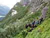 Terrenget på vestsida av Hyefjorden er vilt og vakkert. Jakta er strabasiøs, men spennande. – Dette er eit fantastisk terreng for hjorten, seier Torbjørn Sælen. Frå venstre: Anders Ommedal, Torbjørn Sælen, Johnny Loen, Randi Holme, Knut Åge Hauge, Kåre Holme og Lars Holme. (Foto: Oddvin Holme)