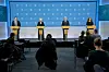 Assisterande helsedirektør Espen Rostrup Nakstad, helse- og omsorgsminister Ingvild Kjerkol, statsminister Jonas Gahr Støre og FHI-direktør Camilla Stoltenberg under pressekonferansen om koronasituasjonen i Noreg fredag. Foto: Torstein Bøe/NTB/NPK.