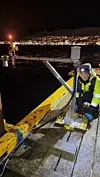 Kartverkets permanente vasstandsmålar i Hammerfest blei reparert i desember etter å ha vorte utsett for hærverk to gonger. 29. januar i fjor blei det målt ekstremt høgvatn som i gjennomsnitt skjer éin gong kvart 50. år. Den 12. mars 2024 blei Hammerfest råka av ekstremt lågt lågvatn. Foto: Kjetil Ydstebø/Kartverket.