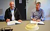 Harald Even Fosse (til v.) og Svenn Finden under signering av kontrakt om utbetring av Riksvegen mellom Leikanger og Sogndal. Foto: Ole Kristian Åset, Statens vegvesen.
