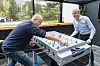 Sp-leiar Trygve Slagsvold Vedum (t.v.) og Ap-leiar Jonas Gahr Støre møttest til ein fotballspelkamp i ein pause under regjeringsforhandlingane på Hurdalsjøen Hotell tysdag. Dei to er einige om å gje full momskompensasjon til frivillig sektor. Foto: Terje Pedersen/NTB/NPK.