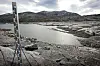 Trass mykje regn har vassmagasina framleis mindre vatn enn vanleg på denne tida. Her frå førre gong det var så låg vasstand i Noreg, i 2006. Det er så lite vatn at målestaven står på tørr grunn ved vassmagasinet Osvatnet i Torbudalen ved Sunndalsøra. Foto: Gorm Kallestad/NTB/NPK.