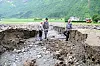 Årsaka er usikker, men ei demme som brast høgt oppe i fjellsida kan vere årsaka til at elva tok nytt løp. Det førte til store skadar på dyrka mark. Per Jarle Myklebust (t.h.), Geir Thomas Myklebust og sonen Gaute (11) studerer skadane.